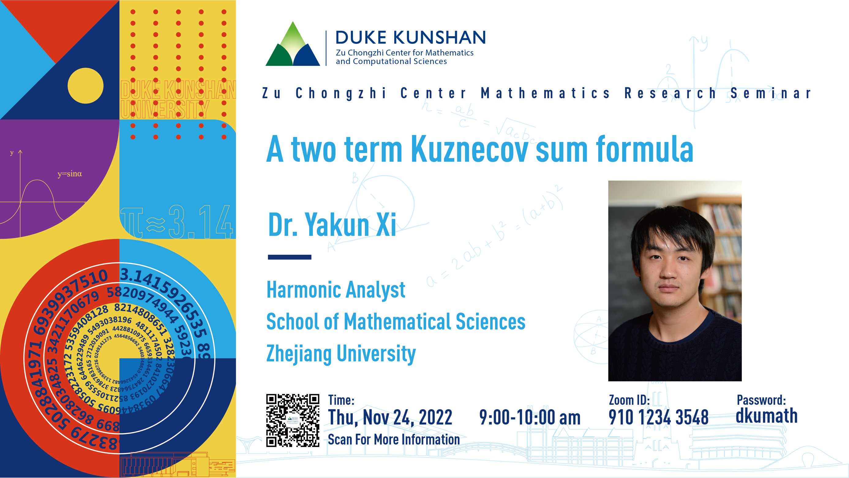 Bio: Yakun Xi is a harmonic analyst at School of Mathematical Sciences, Zhejiang University. In 2017, he received his Ph.D. from Johns Hopkins University, advised by Prof. Christopher D. Sogge. He worked as a visiting assistant professor at University of Rochester from 2017 to 2020, and joined Zhejiang University in 2020.