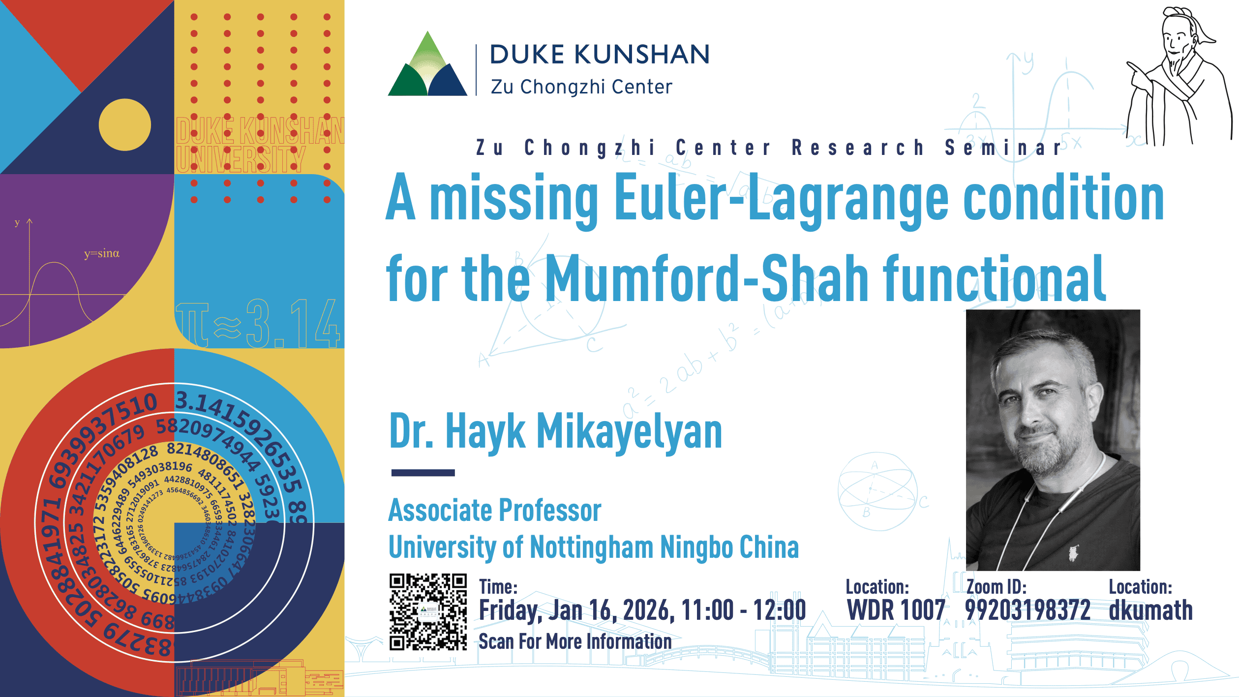 Bio: Dr Hayk Mikayelyan has graduated from Yerevan State University in Armenia (1999) and obtained his PhD from Potsdam University in Germany (2003). After a PostDoc position at Leipzig University he joined the Max Planck Institute for Mathematics in the Sciences in Leipzig (Germany) in 2005. Since 2012 Hayk works in China, first at XJTLU, and from 2015 at the University of Nottingham Ningbo China. PDEs with geometric features, particularly free boundary and free discontinuity problems, are of his research interest. Among awards one could mention the NSFC research grant and the Lord Dearing teaching award.
