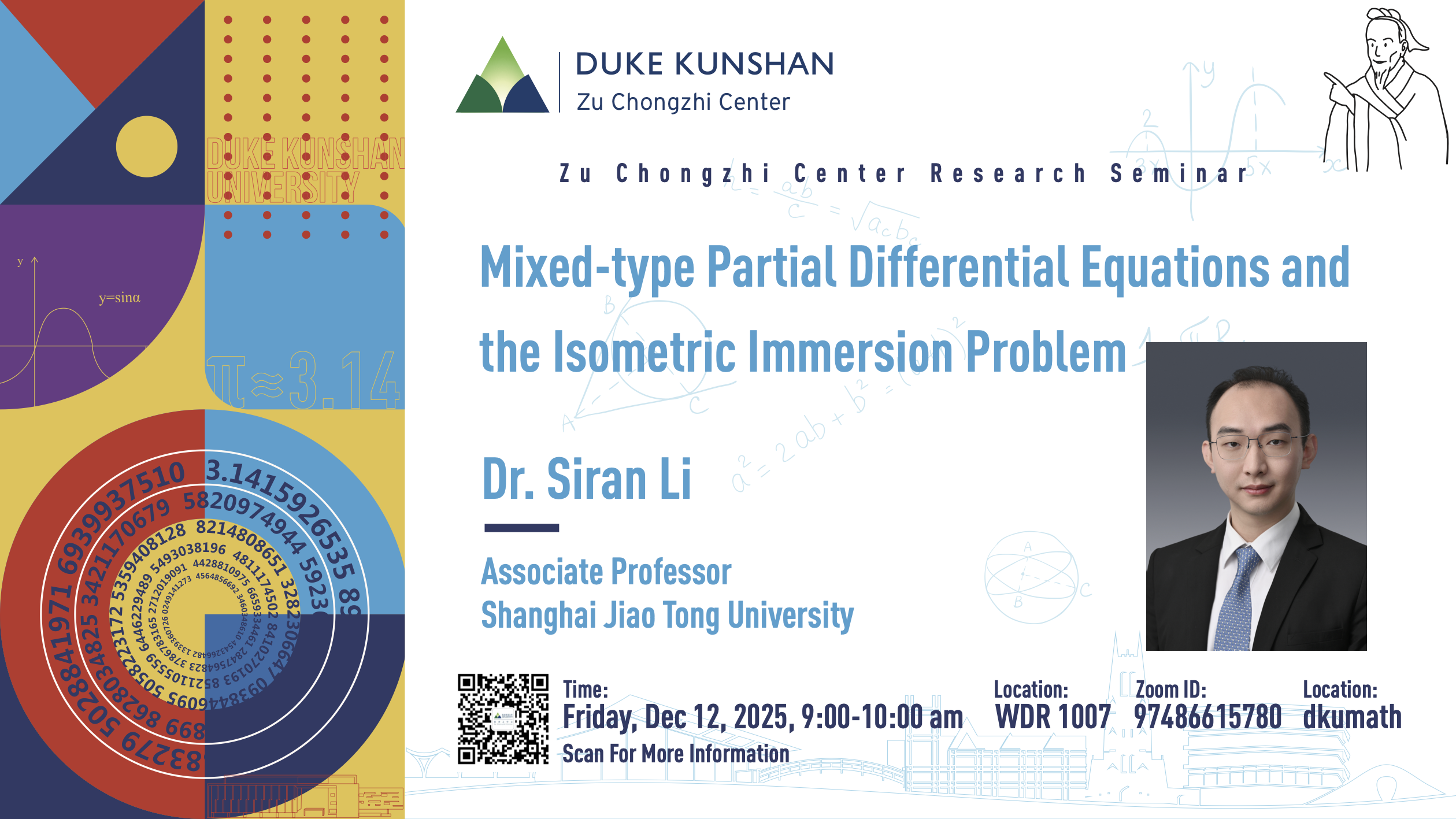 Bio: Siran Li works in the analysis of partial differential equations (PDEs), with a focus on the well-posedness theory of mixed-type PDEs arising from fluid dynamics and differential geometry. Siran received his D.Phil. degree in mathematics from the University of Oxford in 2017 under the supervision of Gui-Qiang Chen. He was a G. C. Evans instructor at Rice University from 2017 to 2020, mentored by Robert Hardt, and a visiting assistant professor at NYU-Shanghai in 2020-2021. Siran joined Shanghai Jiao Tong University as a tenure-track associate professor in September 2021.