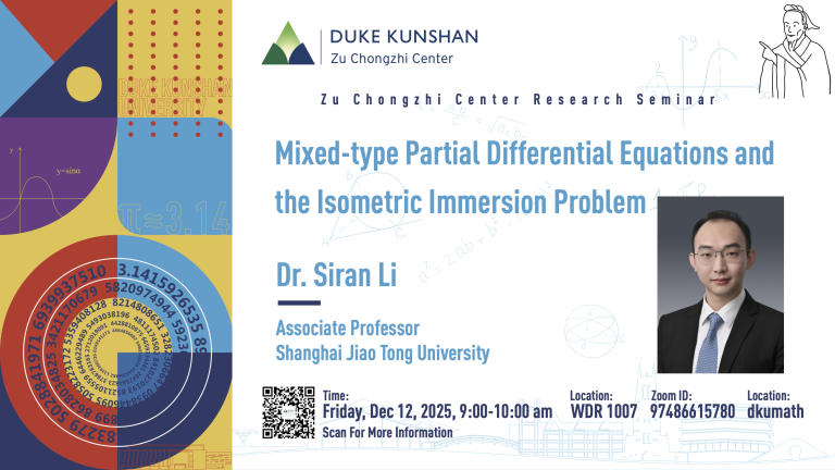 Bio: Siran Li works in the analysis of partial differential equations (PDEs), with a focus on the well-posedness theory of mixed-type PDEs arising from fluid dynamics and differential geometry. Siran received his D.Phil. degree in mathematics from the University of Oxford in 2017 under the supervision of Gui-Qiang Chen. He was a G. C. Evans instructor at Rice University from 2017 to 2020, mentored by Robert Hardt, and a visiting assistant professor at NYU-Shanghai in 2020-2021. Siran joined Shanghai Jiao Tong University as a tenure-track associate professor in September 2021.