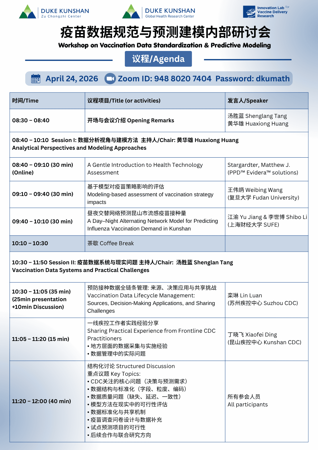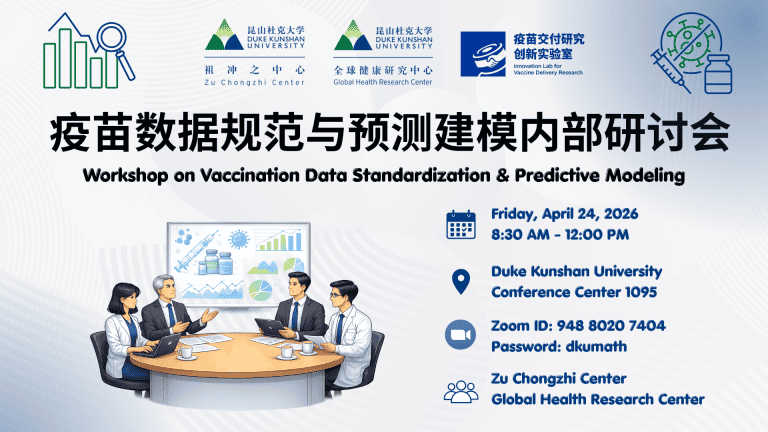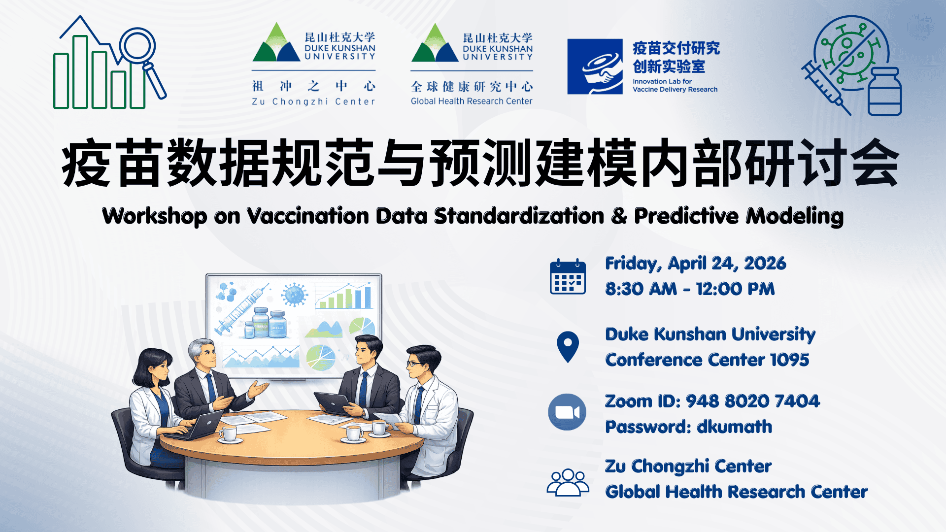 The Workshop on Vaccination Data Standardization & Predictive Modeling (疫苗数据规范与预测建模内部研讨会) jointly organized by the Zu Chongzhi Center and the Global Health Research Center will take place on this Friday, April 24. More details can be found on the agenda.