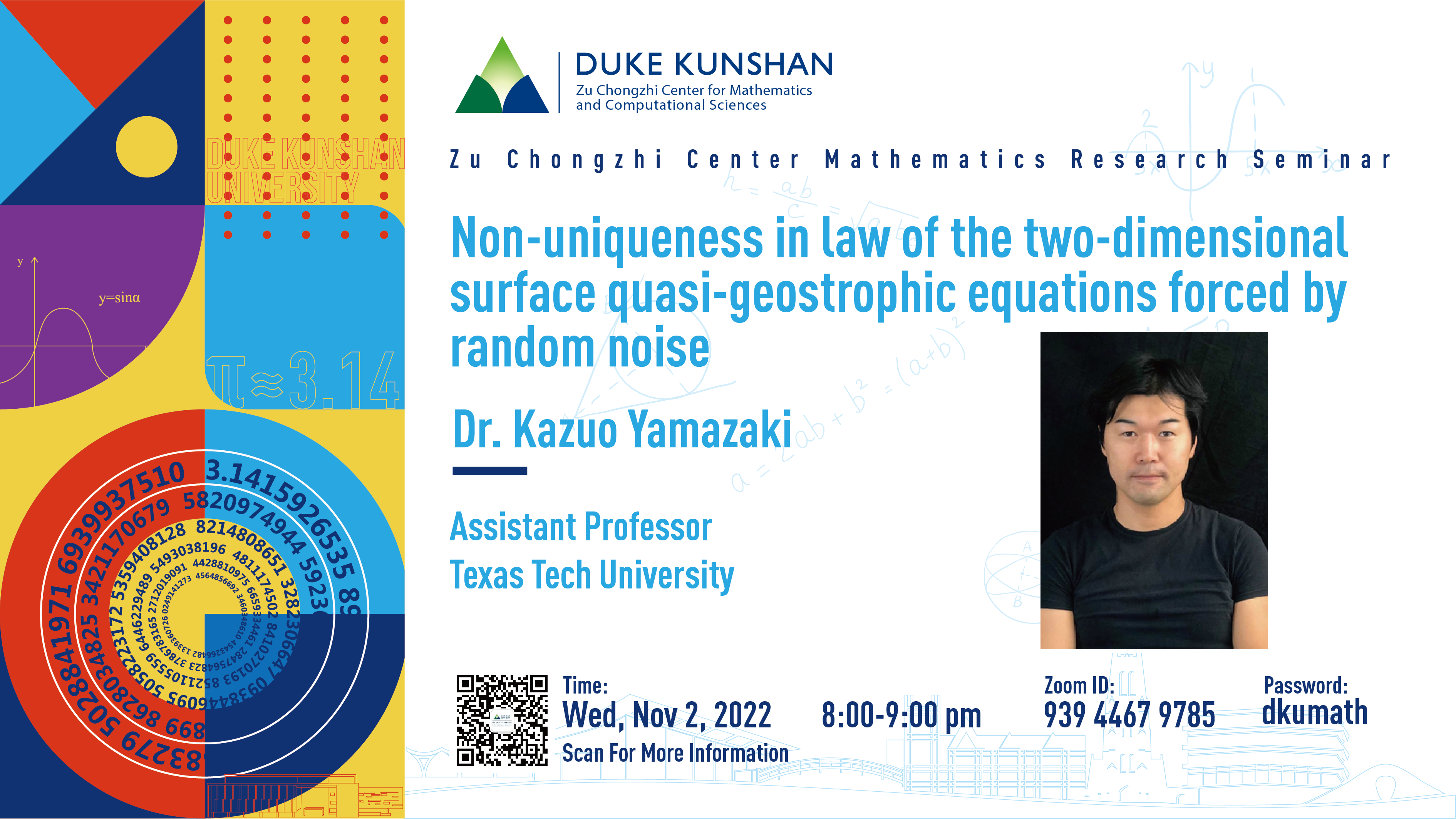 Bio: Kazuo Yamazaki got his PhD from Oklahoma State University, he is currently Assistant Professor at Texas Tech University. His research interests are analysis on PDEs from fluid mechanics, mathematical biology, and physics using tools from harmonic and stochastic analysis.
