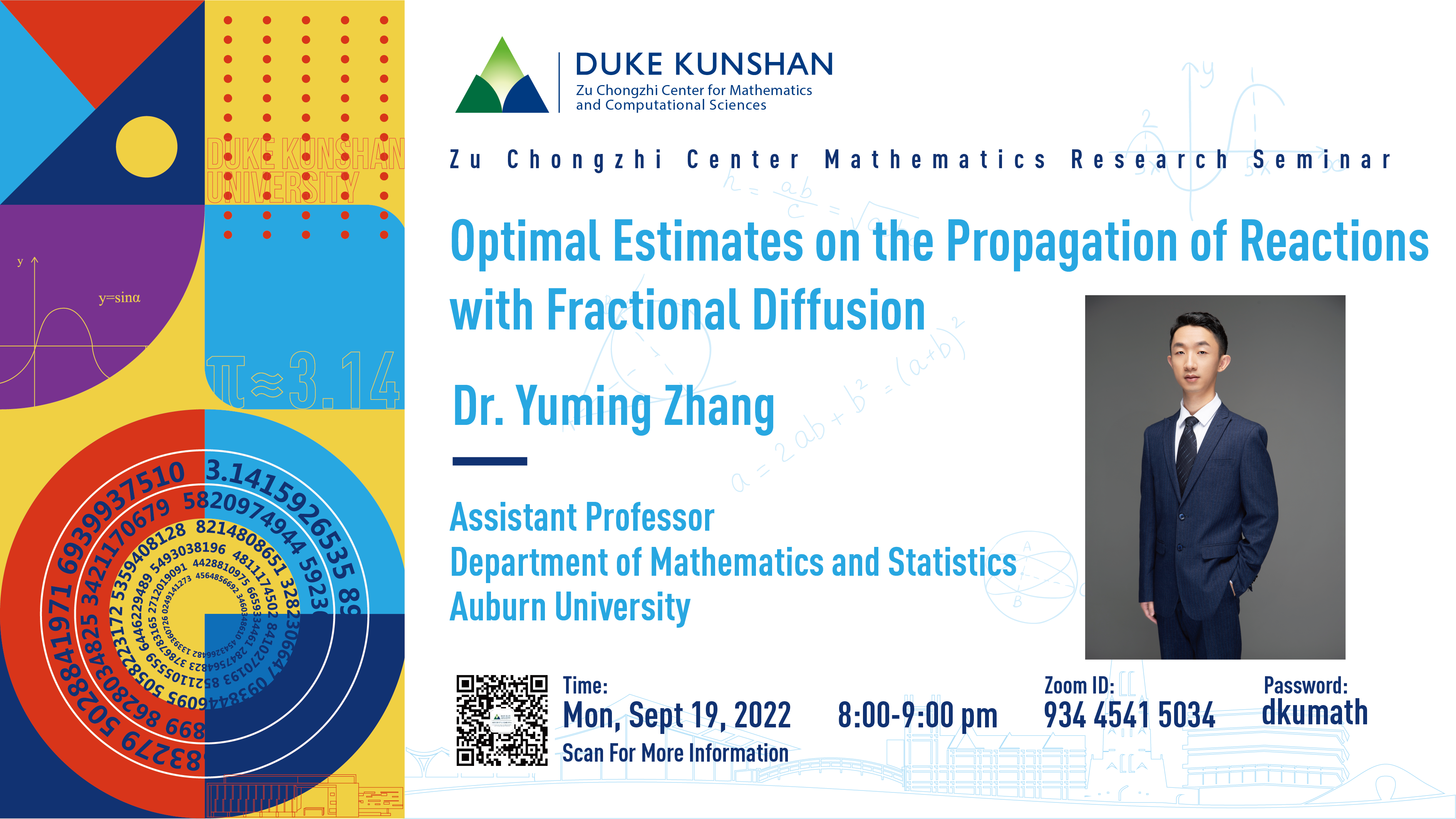 Bio: Yuming Zhang got his PhD from University of California, Los Angeles in 2019. He is currently an assistant professor at Auburn University. He works on partial differential equations. More precisely, he is interested in stochastic homogenization, reaction-diffusion equations, free boundary problems, regularity problems, and optimal transport.