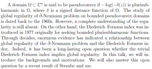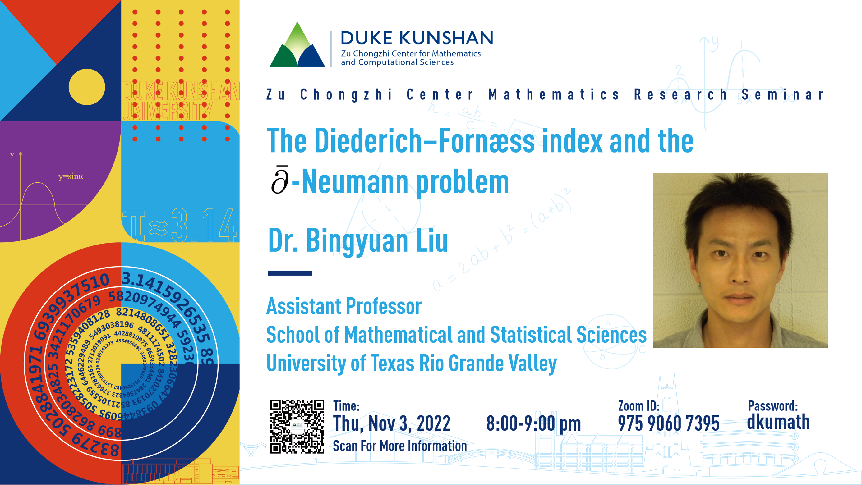 Bio: Prof. Liu is an Assistant Professor at the University of Texas Rio Grande Valley. He received his PhD from Washington University in St. Louis. After his graduation, Prof. Liu served as a postdoc at University of California at Riverside and University of Arkansas. Prof. Liu’s research lies in several complex variables, complex geometry, and PDEs. Many of his work have been published in prestigious journals including Advances in Mathematics, Communications in Partial Differential Equations, Indiana University Mathematics Journal.