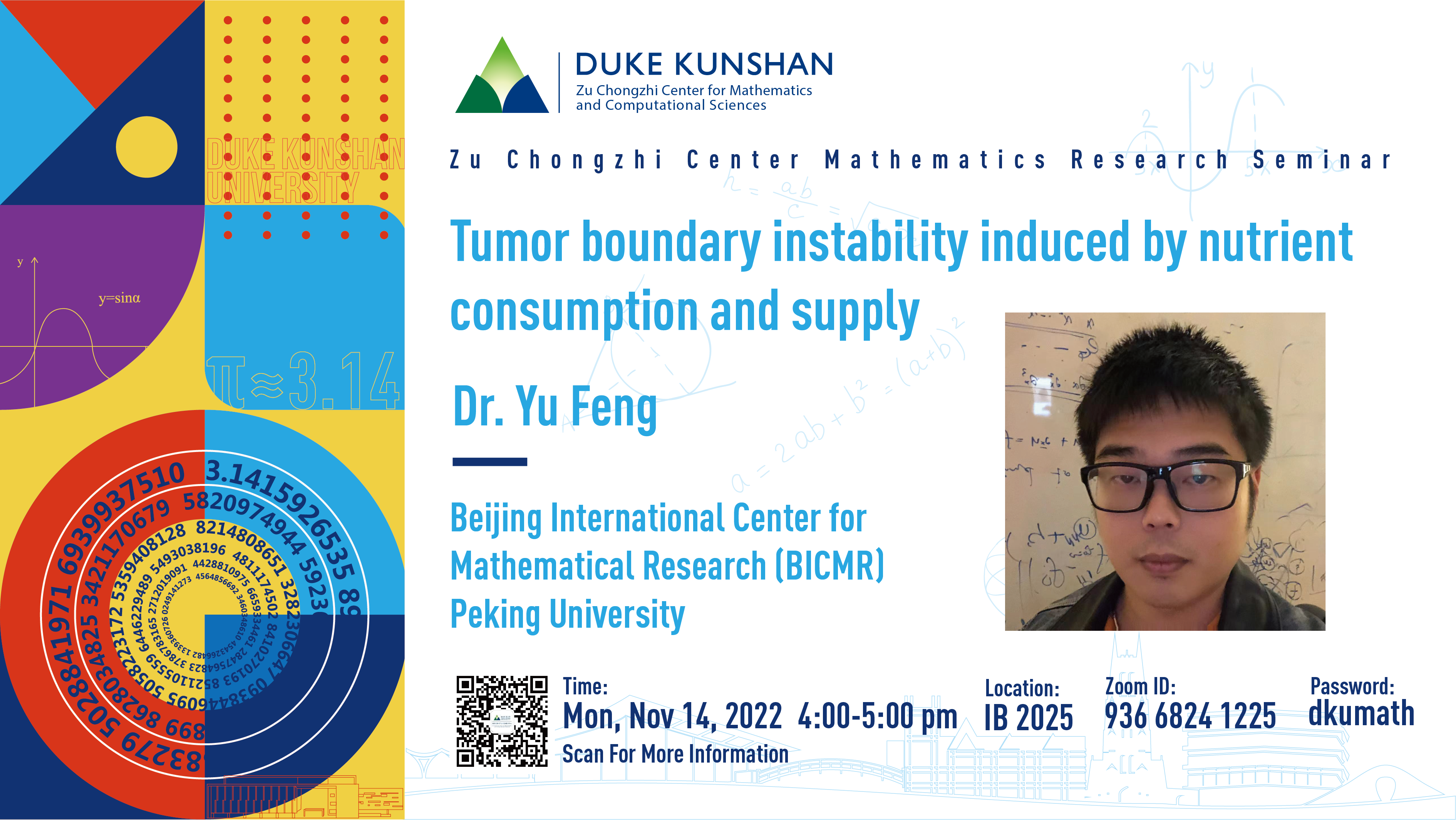 Bio: Yu Feng obtained his PhD from the University of Wisconsin, Madison. He is currently a postdoc at the Beijing International Center for Mathematical Research (BICMR) at Peking University. His research interests are theoretical applied math and mathematical physics, which include mixing and dissipation enhancement in fluid dynamics, PDEs in mathematical biology (Tumor growth and Neurosciences), inverse problem and narrow exit problem.